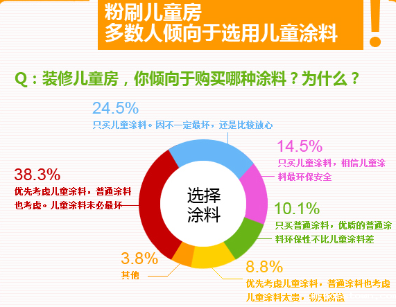 总结:有儿童装修经历或不久后进行儿童房装修的人群中,对儿童房所用的涂料最注重的是硅藻泥涂料的环保型。