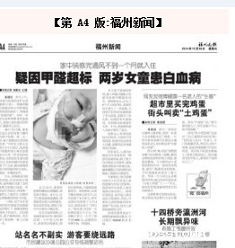 2014年11月30日,《福州晚报》上刊登了一篇题为《疑因甲醛超标 两岁女童患白血病》,让社会的目光聚焦在这个不幸的家庭上。孩子患病的原因,家人表示怀疑与之前家里装修后甲醛超标有关,在孩子未满1岁时,曾给老家的房子装修过一次,当时住的房间都刷了油漆,有购买了新的电视柜、床头柜等木漆家居。而当时装修完不到1个月就入住了,之后孩子就经常发烧,但检查也没发现大问题,不曾想是装修导致的。